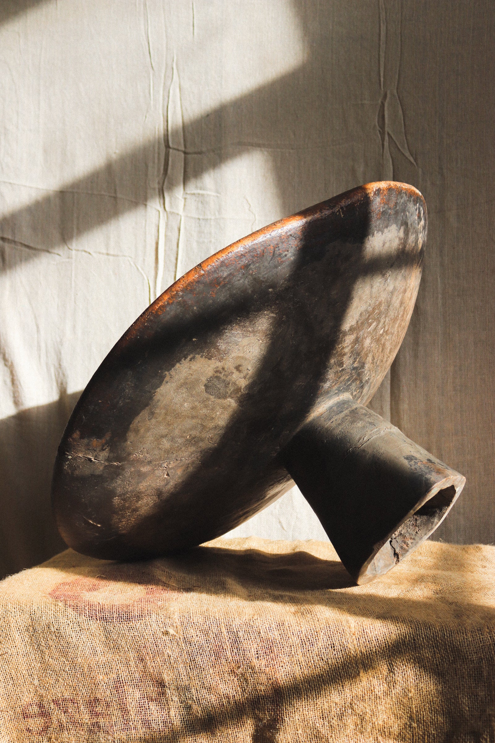 Hand-carved from a single piece of dense walnut wood, with a wide, shallow form raised on a solid central foot. The surface carries a deep, natural patina, with areas of darkening from years of use.